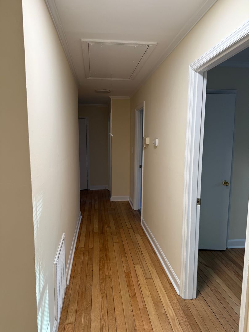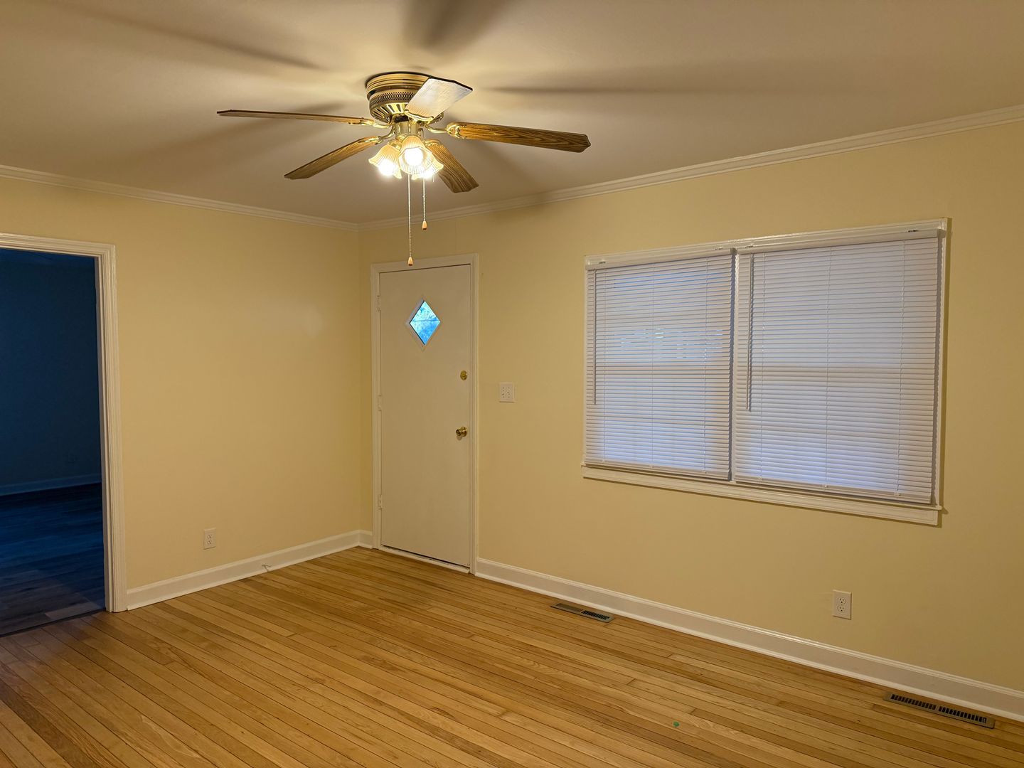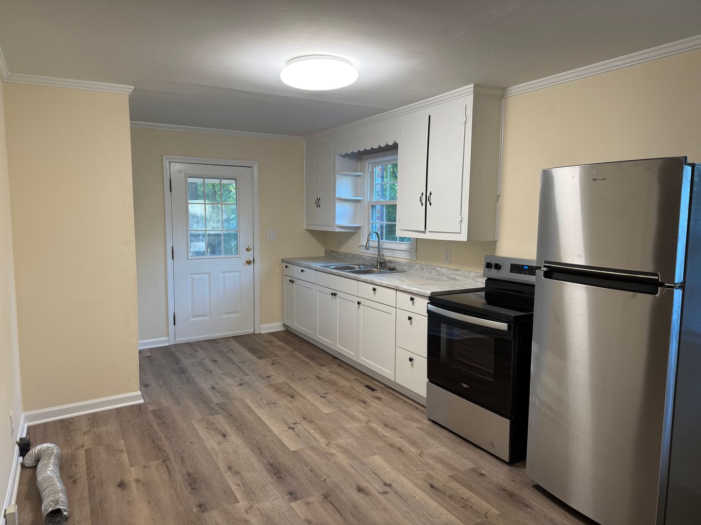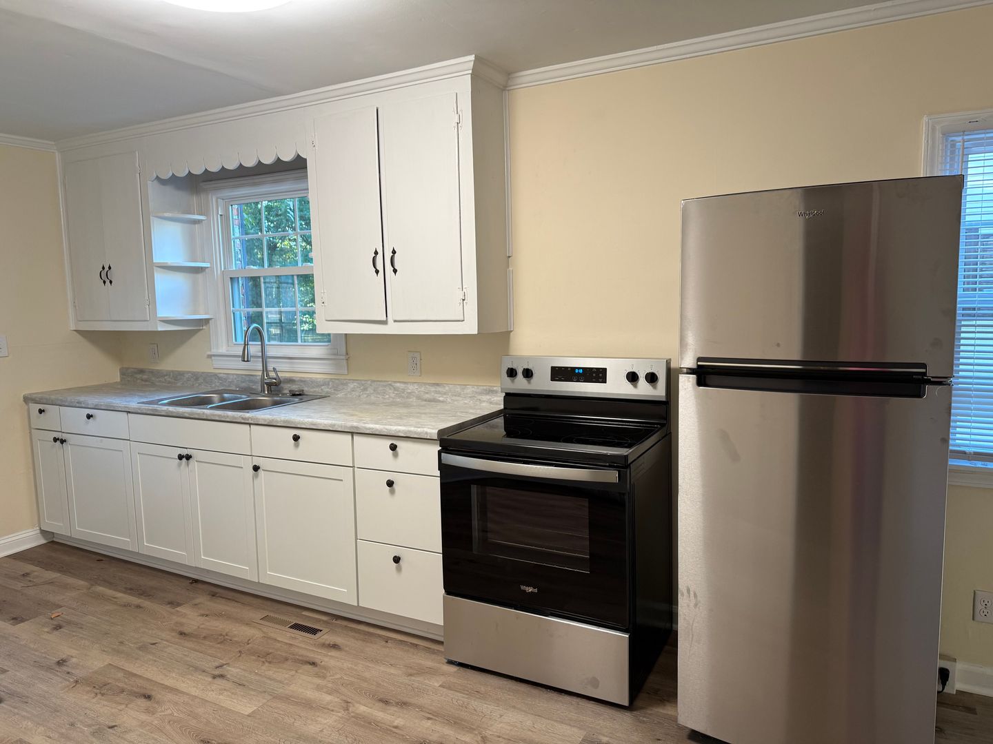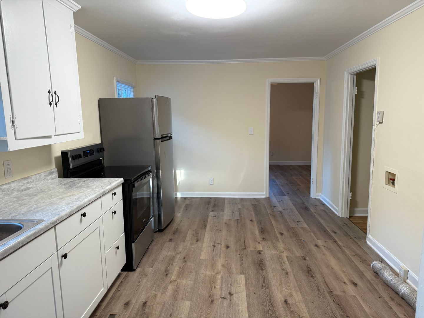 Step onto this inviting porch large enough for rocking chairs or patio furniture to enjoy the outdoors and fresh air. The front door opens into the living room. The property offers a designated dining space and plenty of room to move throughout the kitchen while cooking. The home offers stainless refrigerator and stove as well as a half bath right off of the living space, great for guest to use the restroom without disturbing the primary bath. Beautiful hardwoods through the main part of the house and LVP flooring installed in the kitchen and dining space.